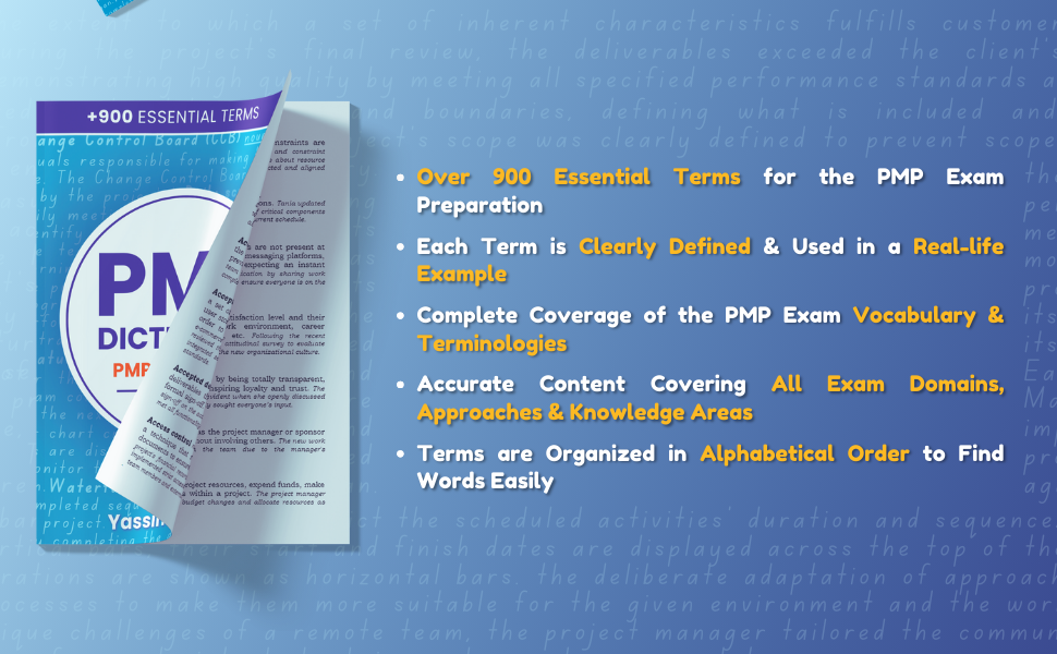 This well-constructed, comprehensive, and accurate dictionary includes every term you could possibly encounter on your PMP exam! Each keyword is defined and used in a real-life example in a project context to exhibit its use and how it can be presented in the PMP Exam situational questions.